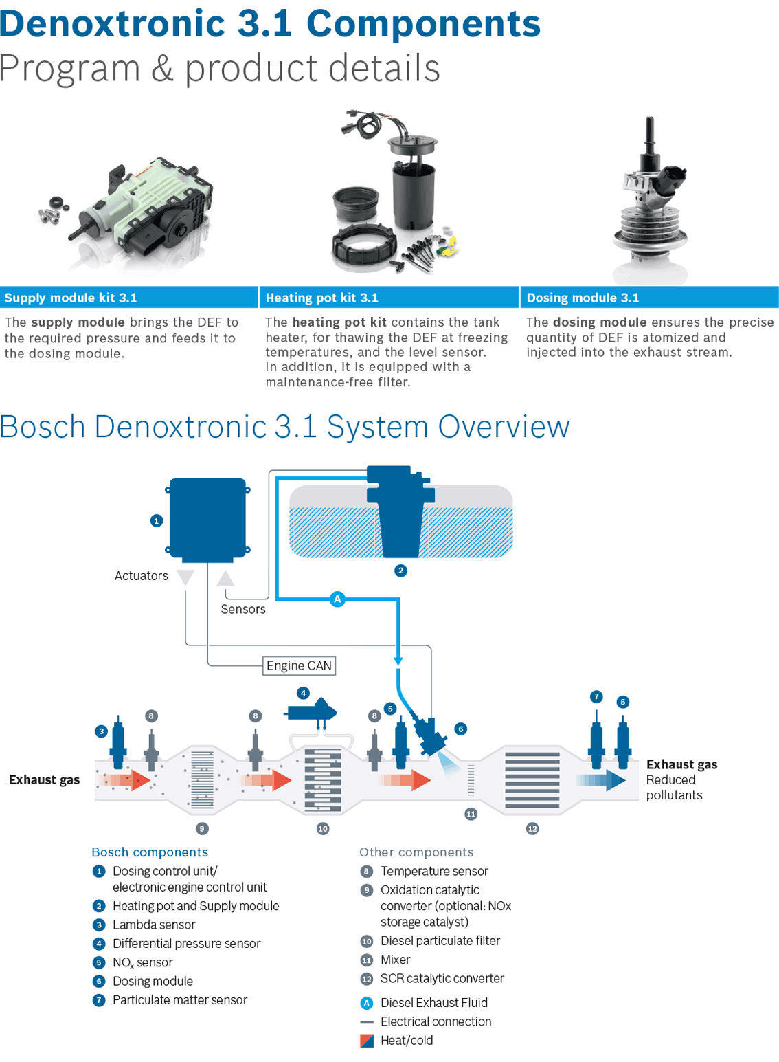 The most common version of Denoxtronic systems in North America is 3.1 and 2.2. For cars and light commercial vehicles, 3.1 has been available since 2008 and 2.2 for heavy commercial since 2009. Today, Bosch Denoxtronic systems are built into vehicles around the world. An increasing number of vehicle manufacturers are using the Bosch system to ensure that diesel vehicles are compliant with emission limits. Many vehicles with Denoxtronic systems have high mileage. As a result, the demand for services and cost-effective maintenance work is increasing.